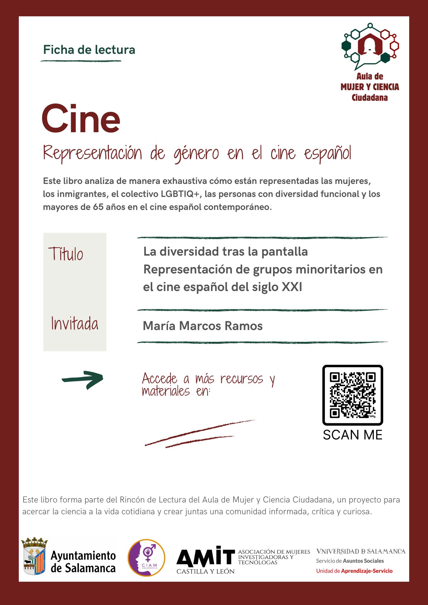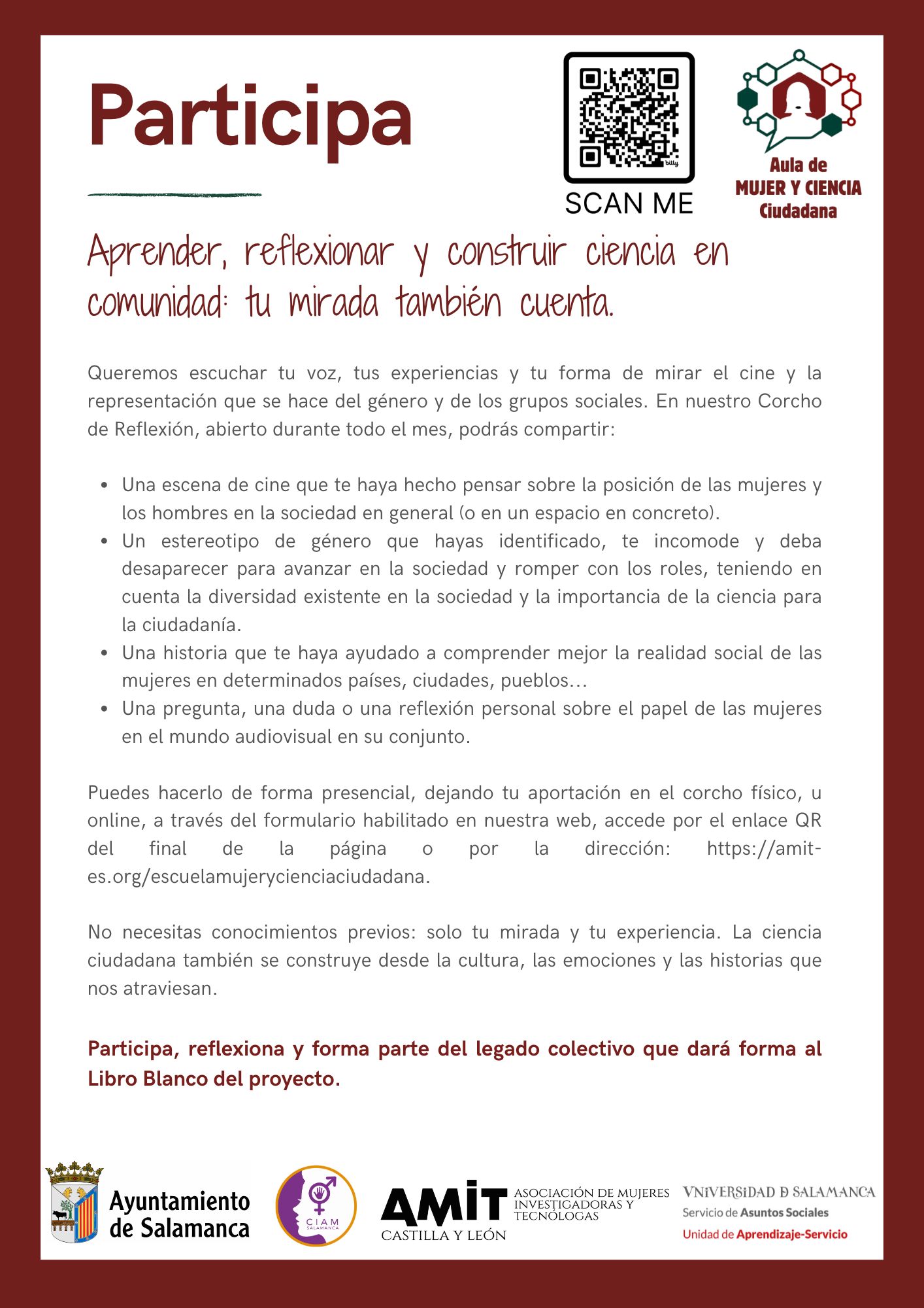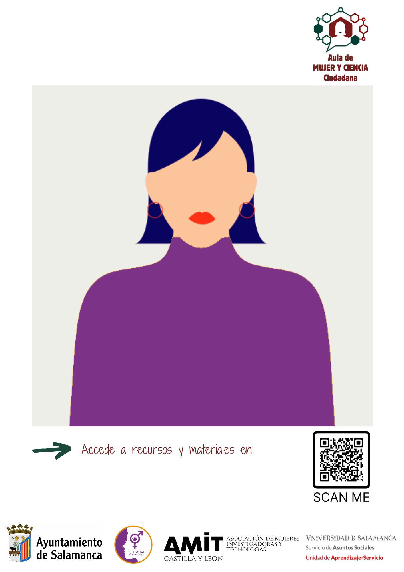 El Aula Municipal de Mujer y Ciencia Ciudadana es un proyecto piloto impulsado por Ayuntamiento de Salamanca y AMIT Castilla y León en colaboración con la Universidad de Salamanca, que propone un programa mensual dinámico y participativo que combina divulgación, reflexión colectiva y creación comunitaria. El Aula, creada para acercar la ciencia a la vida cotidiana de las mujeres de la ciudad se integra en la programación de la Escuela de Igualdad del Ayuntamiento de Salamanca, situada en la Casa de la Mujer Clara Campoamor.